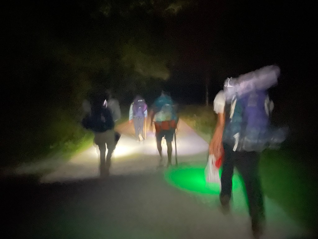 it’s dark, our headlamps cast phenomenal shadows on the bushes and trees,
